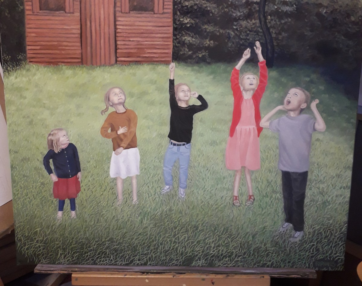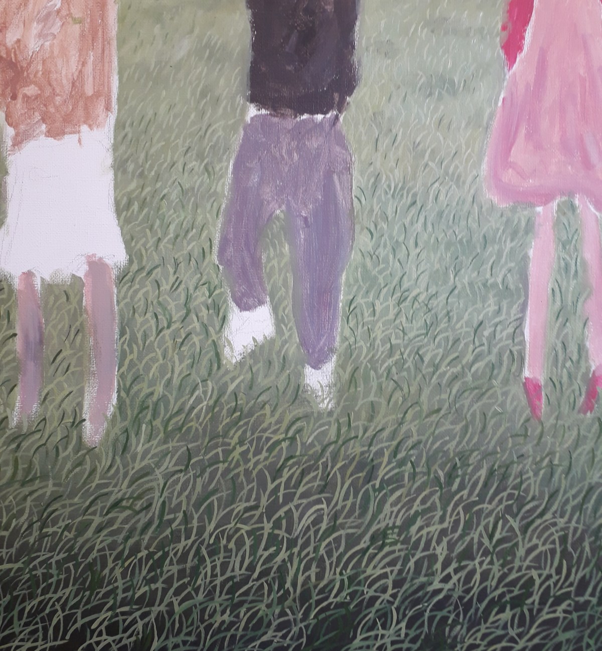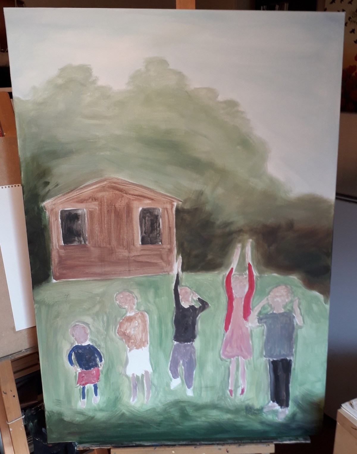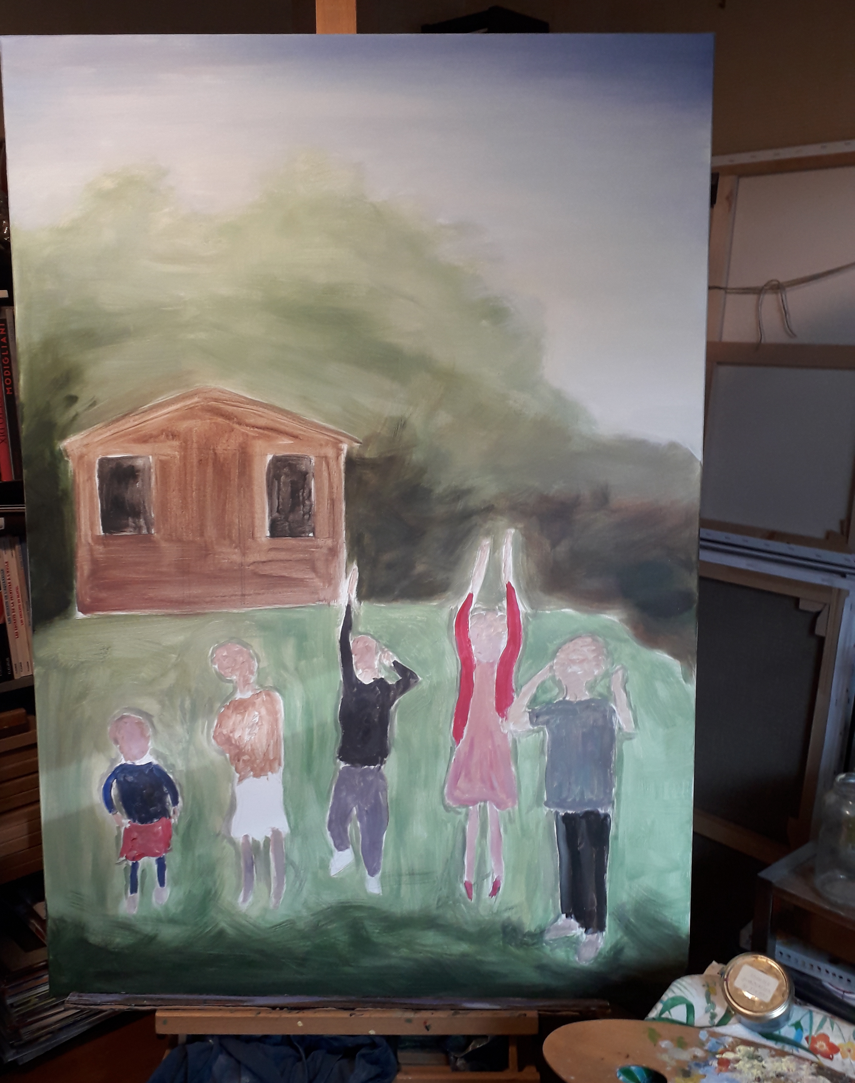 I paint now child by child starting with the one on the right in the foreground because it will help me to proportion the others.