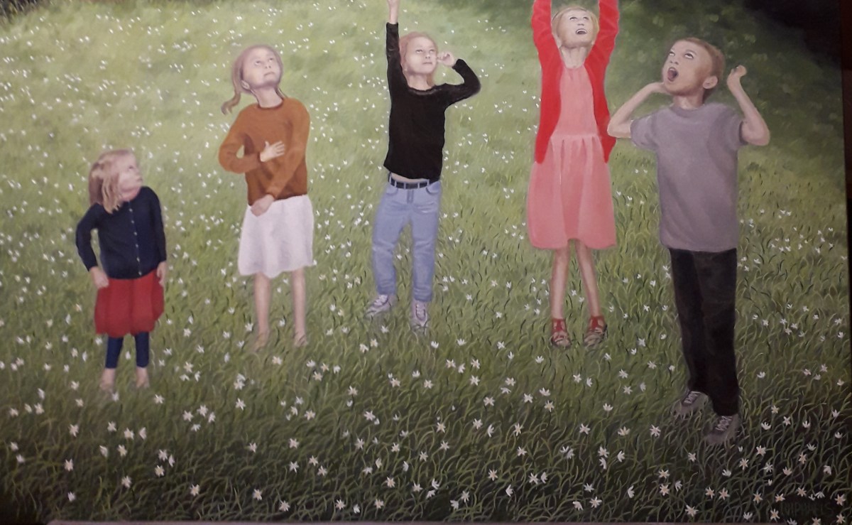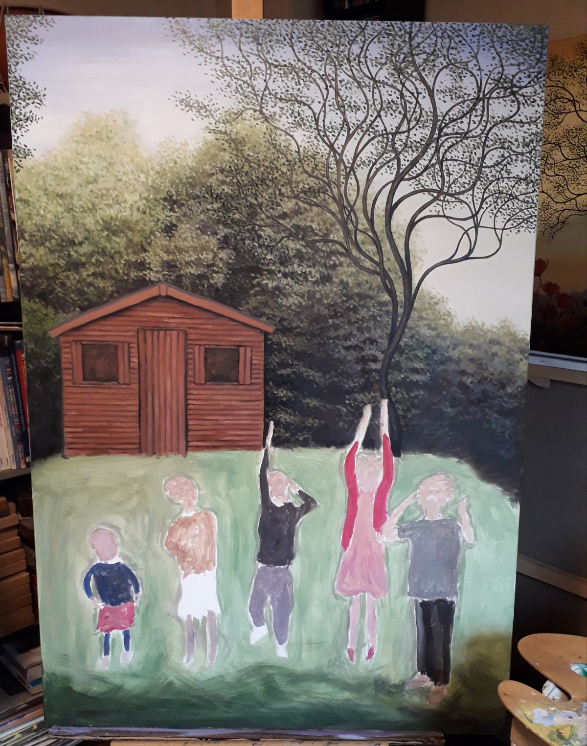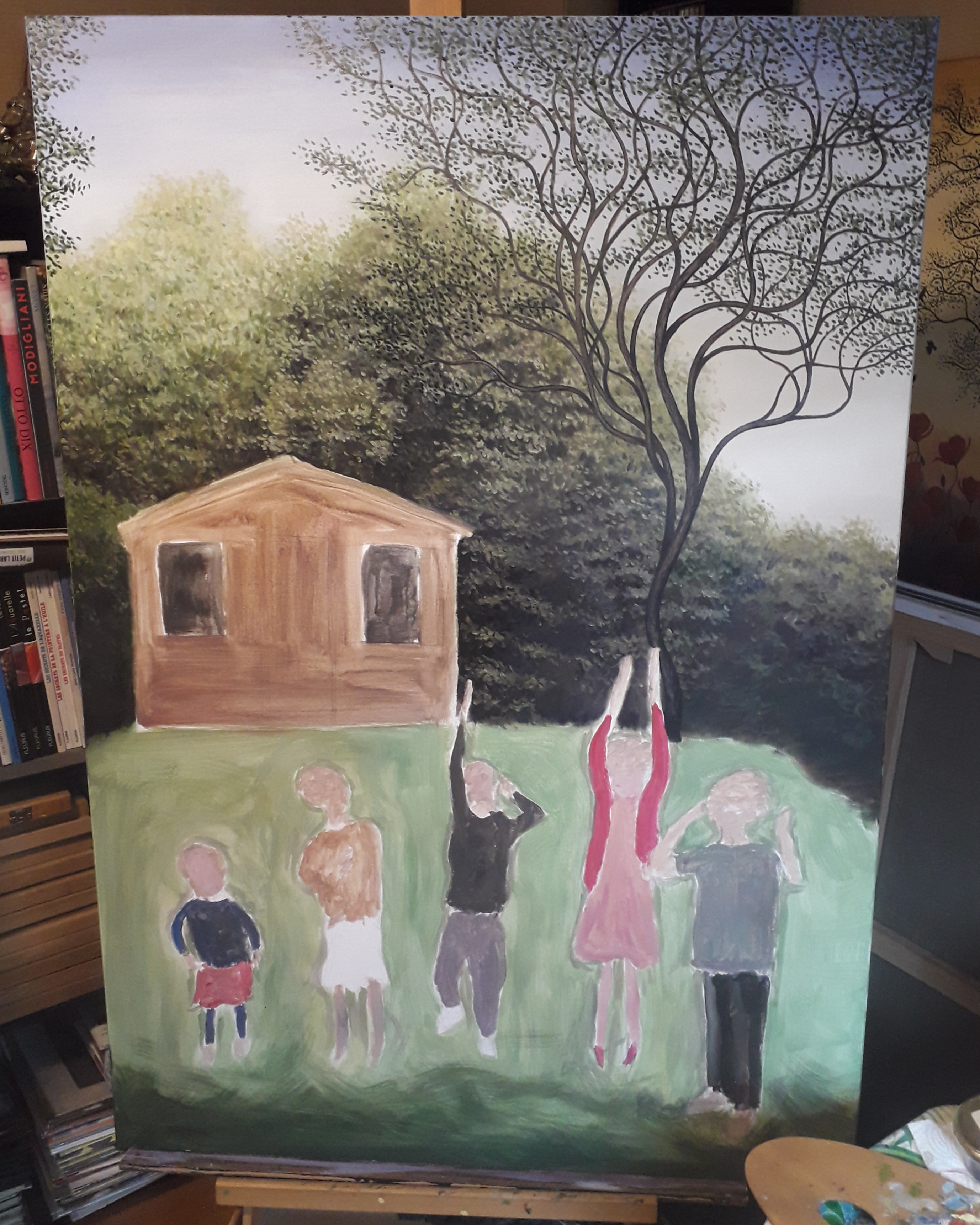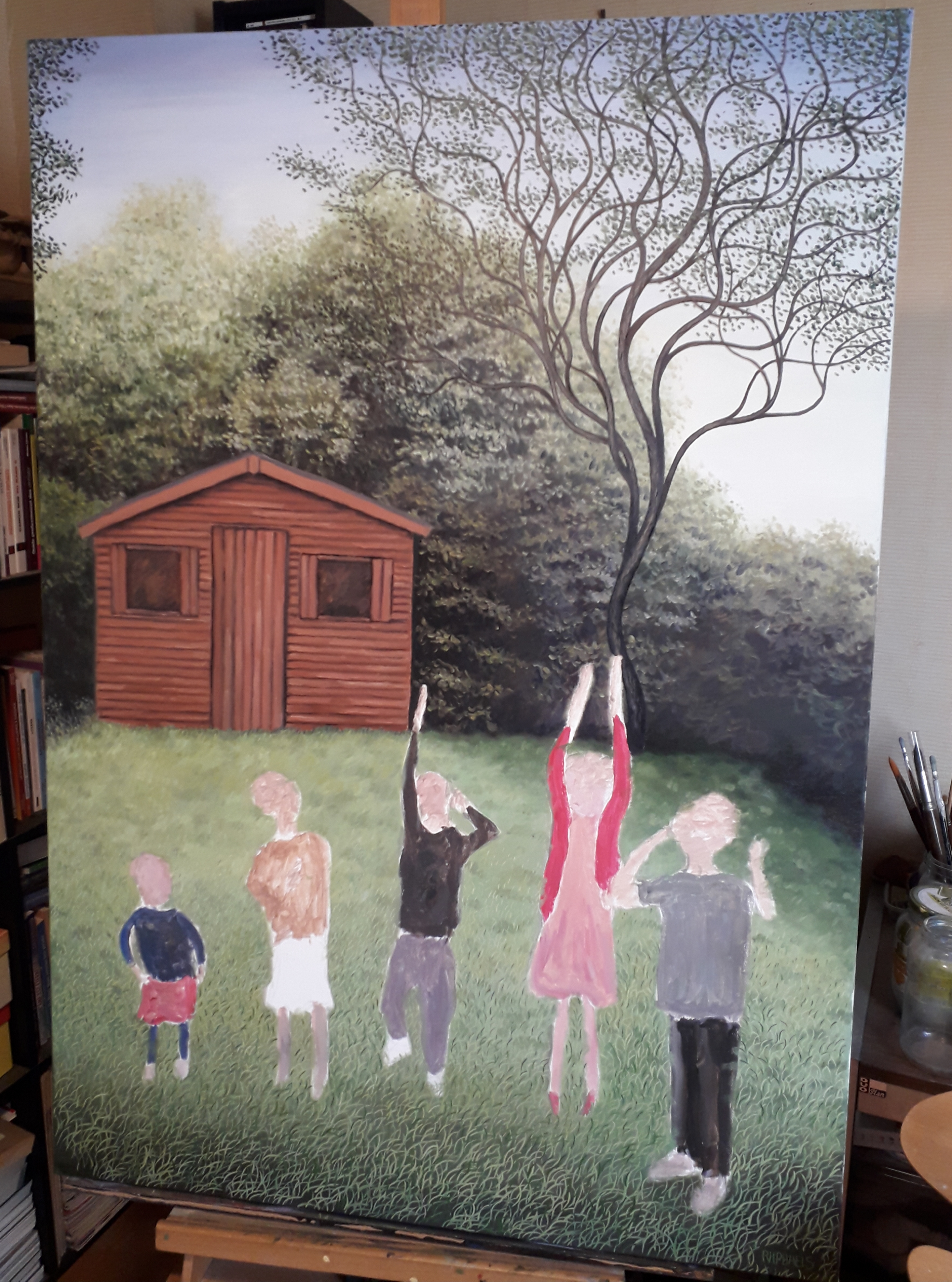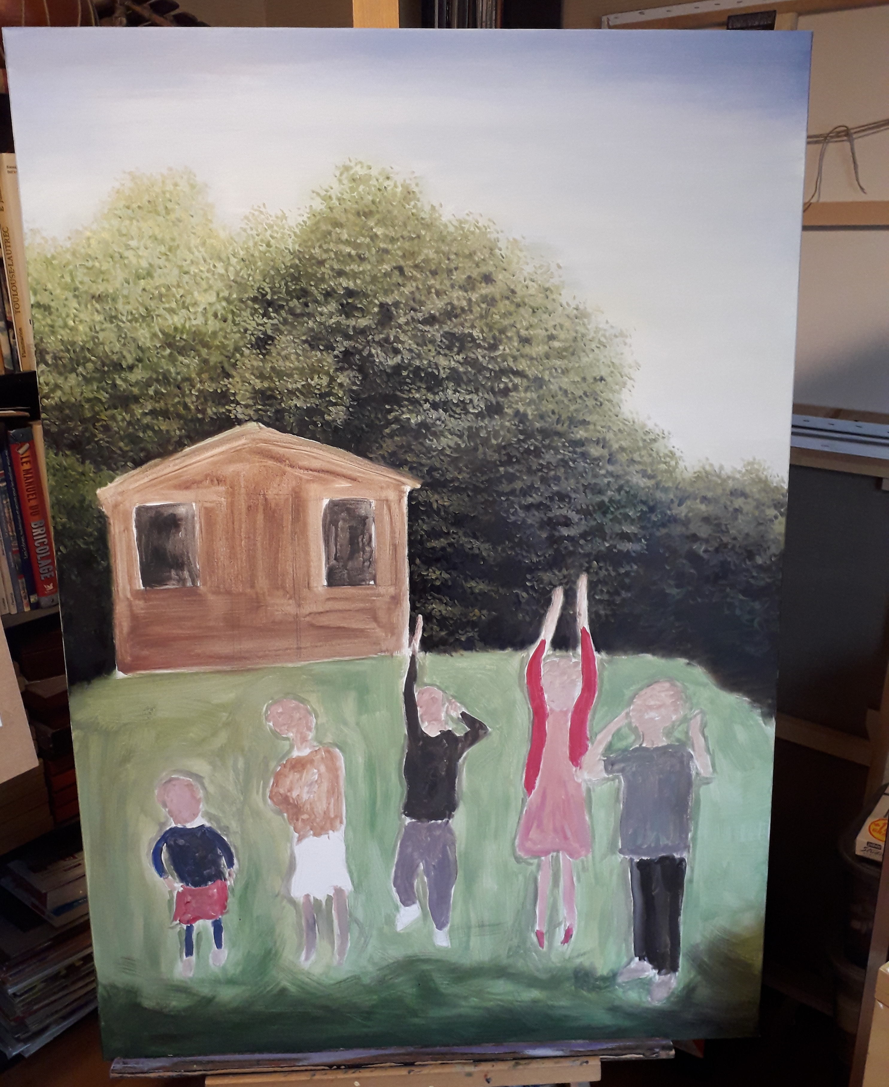 I paint now child by child starting with the one on the right in the foreground because it will help me to proportion the others.