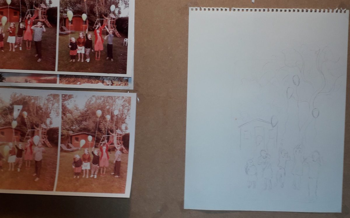 Le “Lâcher-prise” c’est le thème que je veux aborder ici. La jeunesse, le temps qui passe, la vie, la mort, la famille, l’amitié, l’amour… les choses qu’on voudrait changer mais qui nous filent entre les doigts. des fois il est plus difficile de laisser partir les choses que de s’y accrocher aveuglement. Quoi de plus évocateur que des enfants qui jouent. Lors d’un repas familiale j’ai tiré quelques photos d’un lâché de ballon elles me serviront de base pour mon sujet. Je pioche dans chaque cliché les postures qui m’intéressent pour obtenir une scène harmonieuse que j’esquisse sur une feuille blanche. J’accroche le tout sur une planche qui servira de model pour mon œuvre.