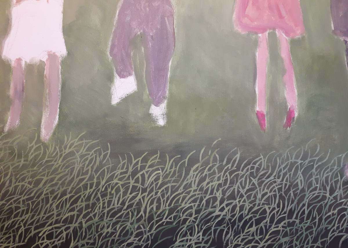 I paint the grass now, I make a second background layer with oil paint diluted with turpentine over the acrylic background layer because it was not homogeneous enough.