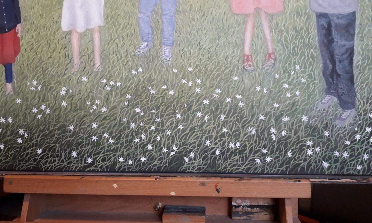 Je peins maintenant l’herbe, je réalise une deuxième couche de fond à la peinture à l’huile dilué à l’essence de térébenthine par dessus l’acrylique car ce n’était pas assez homogène.