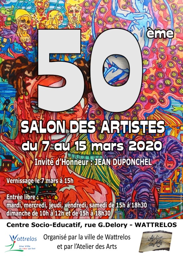 Le 50ème Salon des Artistes, organisé par l’Association des Artistes de l’ATELIER DES ARTS de Wattrelos, en coordination avec la Ville de Wattrelos, se tiendra du 7 au 15 mars 2020 au CENTRE SOCIO-EDUCATIF – 10, rue Gustave Delory à WATTRELOS. (J’y expose deux oeuvres.)